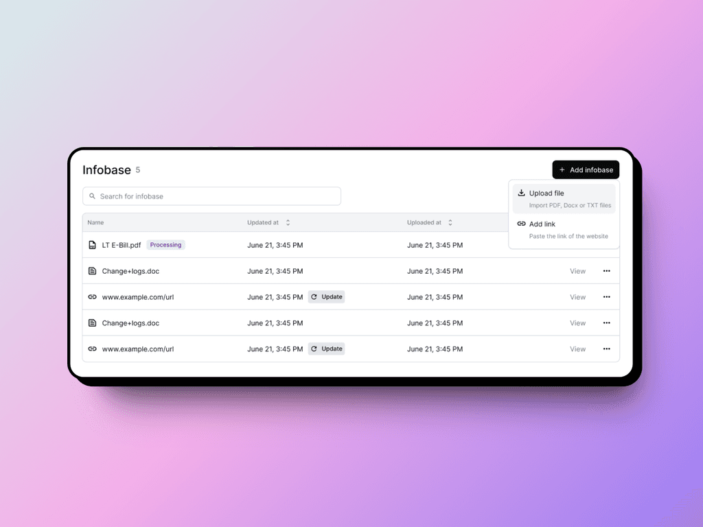 Train your AI with uploaded files and website links to build a comprehensive knowldgebase.